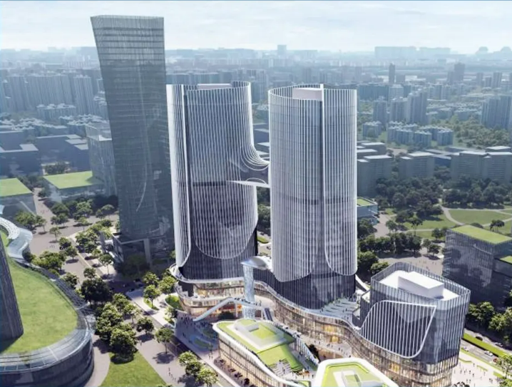 成都每經中心,作為交子公園金融商務區首批落地的標志性項目,總建筑面積約18萬平方米,以“公園中的城市”為理念,打造集辦公、零售、文化設施于一體的空中花園媒體城。其雙塔建筑高達129.8米,以成都山水為靈感,既承載金融商務的活力,也承載城市藝術的氣質。